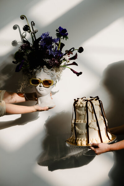 We booked a studio and hand-picked a creative team: Supercut Creative, Alexa Franovitch, Wild Botanical, Hannah Tim Personal Stylist, three cool af models, Wake & Cake, Gemma Bridal, and the Sister handbags Meg insisted on — every prop telling a story.